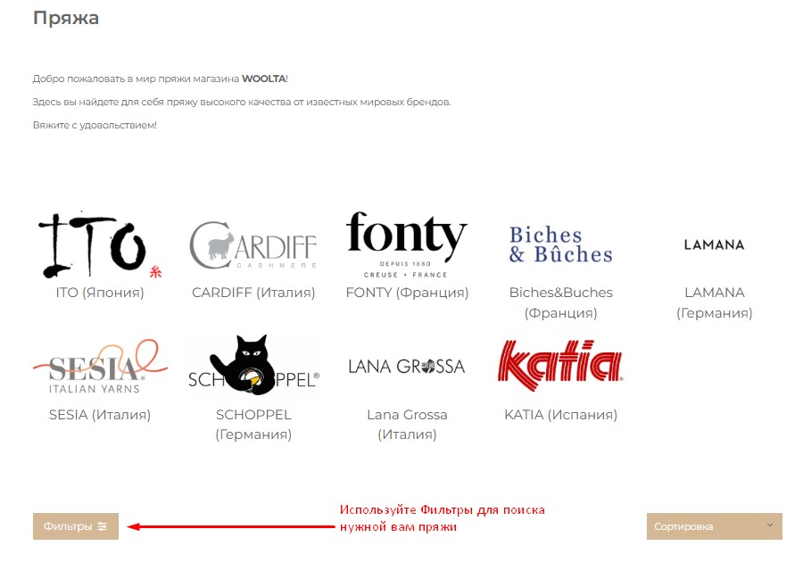 Чтобы быстро найти подходящую пряжу, используйте фильтры в каталоге.