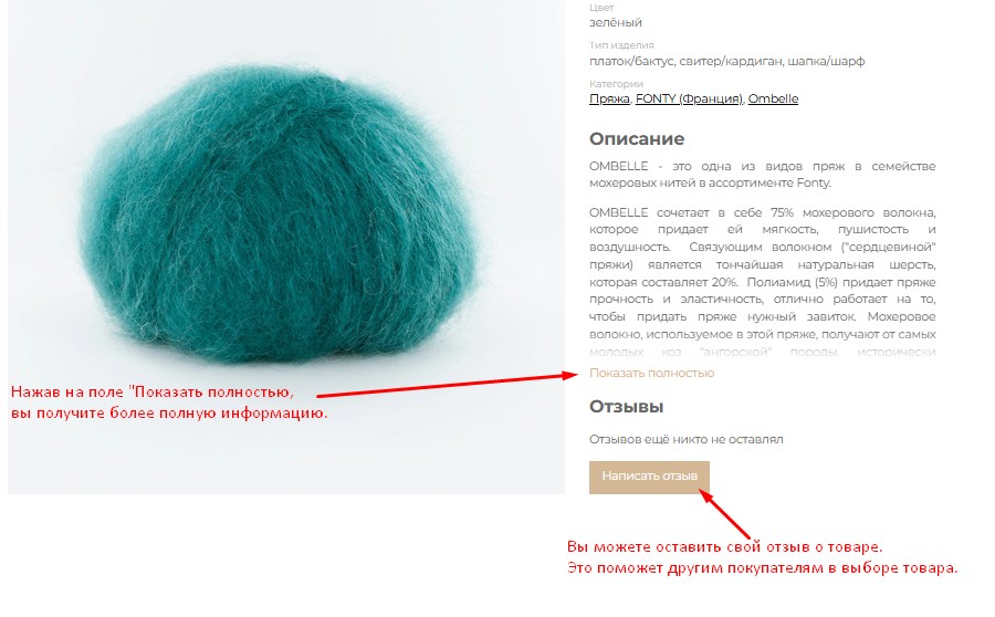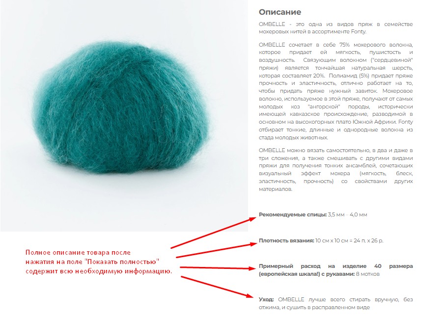 В карточке товара каждого артикула пряжи указаны основные характеристики: