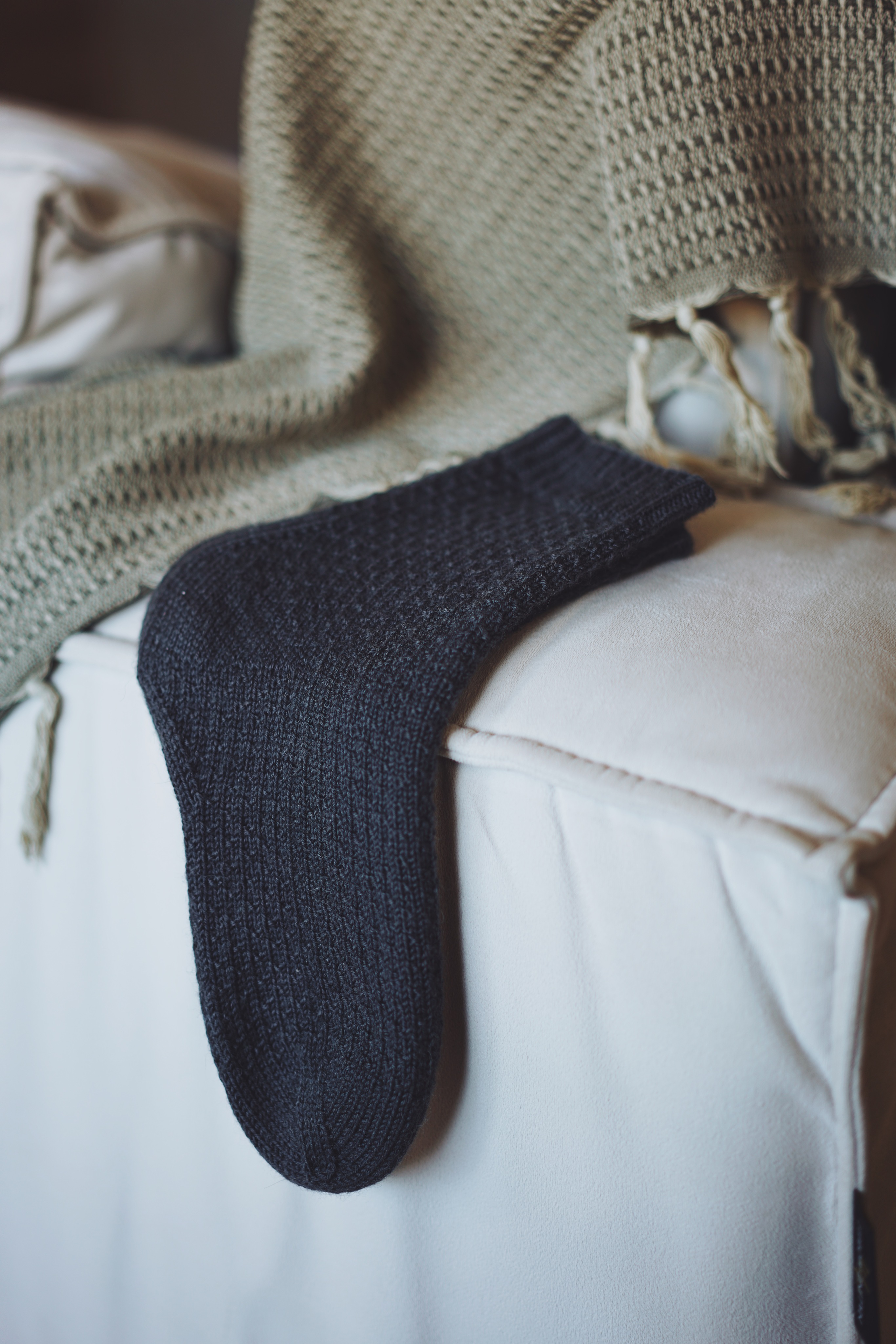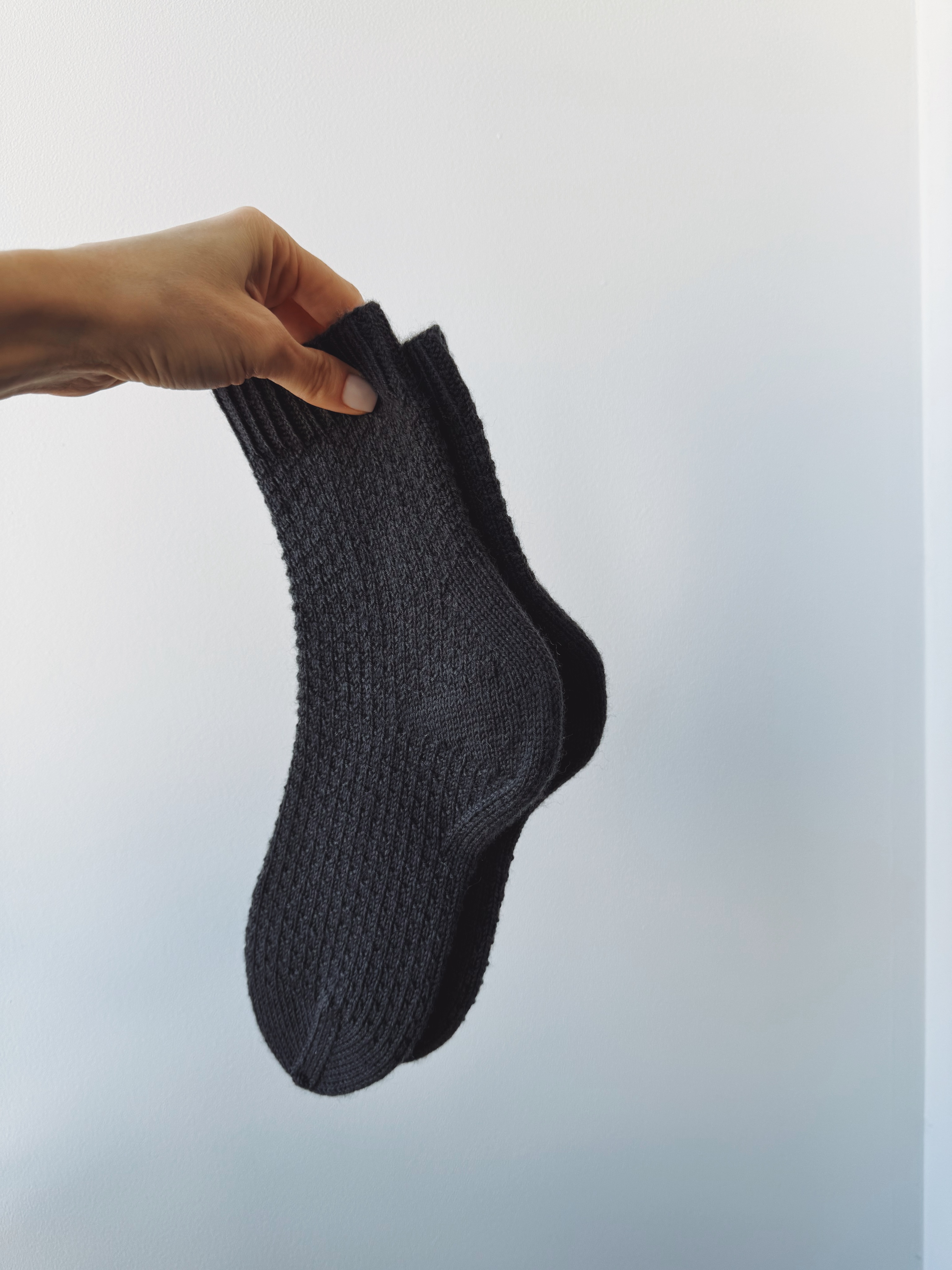 Текстура носков Sand Socks строится из небольших изнаночных петель, которые появляются и исчезают на полотне, словно песчинки, смещающиеся под ногами. Сдержанный и деликатный узор создаёт мягкий ритм, который поддерживает интерес к вязанию, не перегружая его.